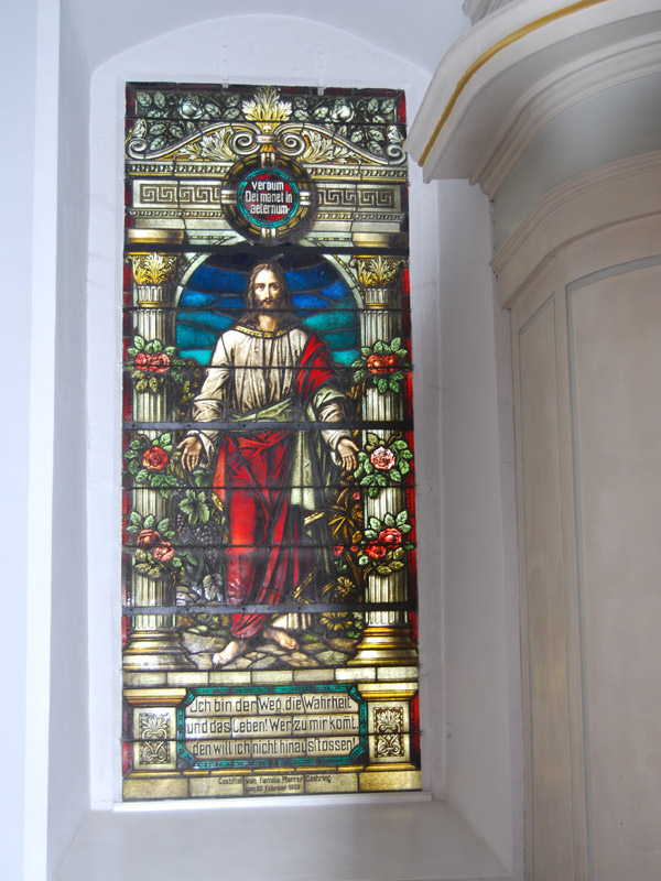 Das Kircheninnere ist von solider Ausstattung, wobei die farbigen Kirchenfenster besonders hervorstechen.